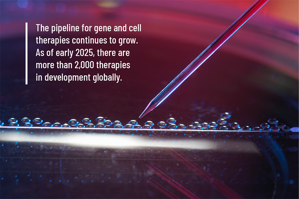 The pipeline for gene and cell therapies continues to grow. As of early 2025, there are more than 2,000 therapies in development globally. At least 35 of these are in Phase 3 clinical trials, and six are in preregistration in the United States.³